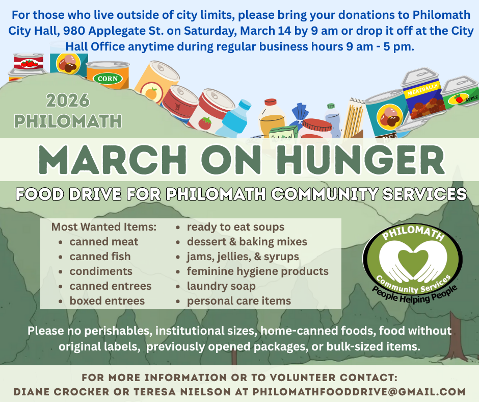 Those who live outside of the city limits can drop off donations at Philomath City Hall during regular business hours of 9 a.m. to 5 p.m. Cash donations are also accepted through the PCS website.